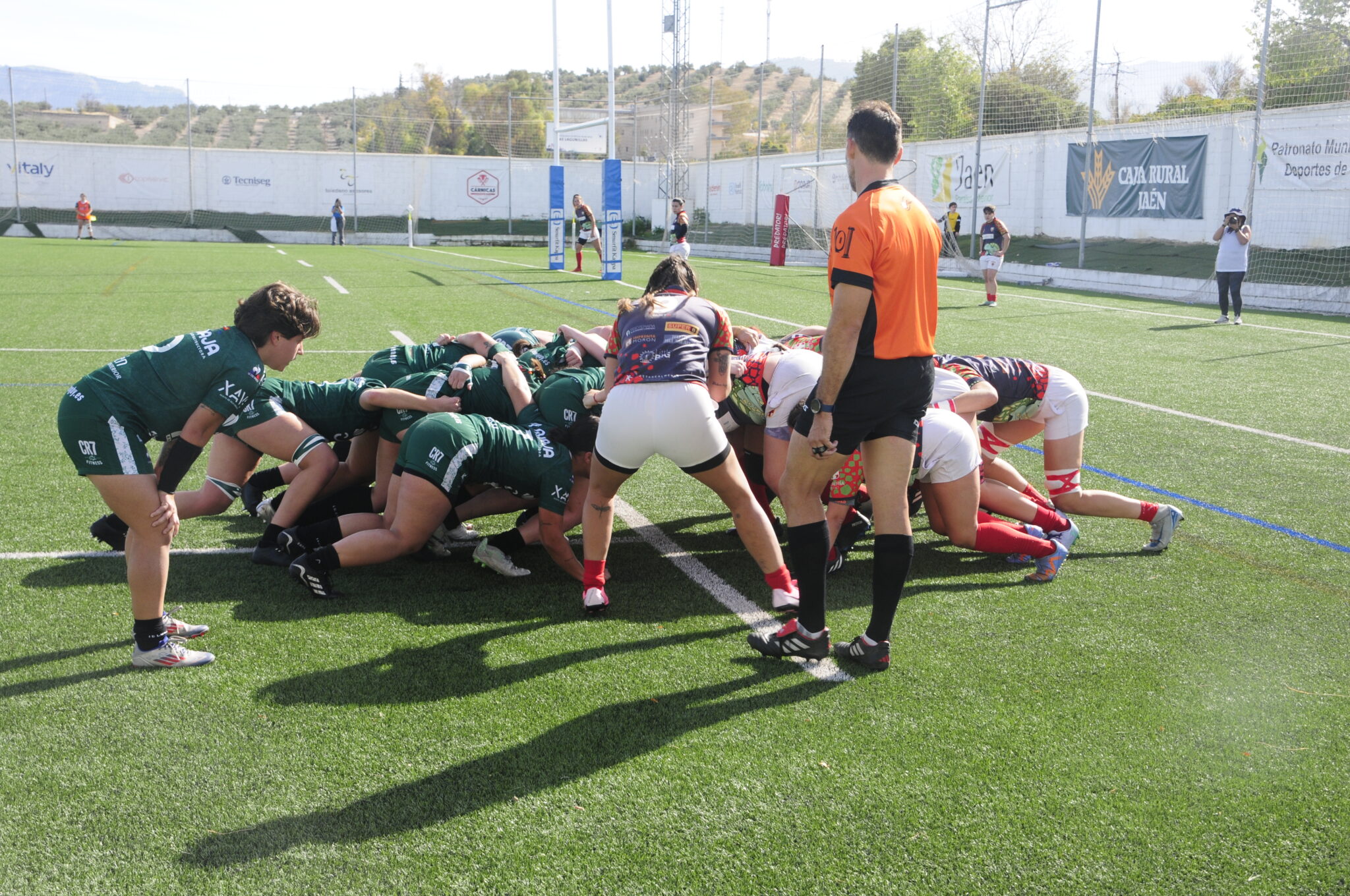 Las jugadoras de UR Almería aprovecharon el saque de centro para situarse en campo jienense. Apenas permanecieron en él dos minutos. Fue cruzar la línea de centro y las de Jaén Rugby se lanzaron a por los puntos. Honrubia volvió a romper la cortina defensiva por velocidad y gracias a sus contrapiés, pero fue «cazada» a pocos metros de la zona de ensayo. Una vez allí, picks and go para agrupar rivales, y abrir el balón. Esta vez fue Camacho la que sirvió en bapndeja el ensayo a Carmen Carmona, que anotó un total de 30 puntos (35-0). La capitana consiguió dos posados y transformó todos los ensayos que lanzó, menos uno.
