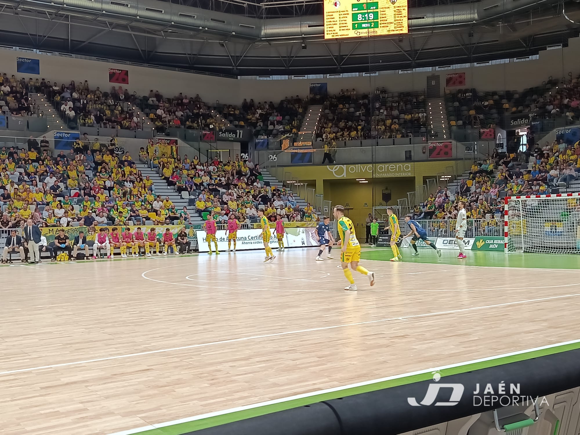 Conforme iba transcurriendo el partido se niveló el partido hasta el punto de que las llegadas más peligrosas eran blanquiverdes, hoy de azul marino, Espíndola era el mejor de los jienenses lo que provocó que Dani Rodríguez pidiese tiempo muerto al no gustarle lo que estaba viendo en el 40×20. Seguía sin reaccionar pero este equipo tiene calidad individual fantástica y Eloy colocaba el esférico en la escuadra izquierda de la portería cordobesa para establecer el 1-0. La ventaja espoleó a la escuadra amarilla donde únicamente el palo evitaba el segundo tanto, pero en la jugada siguiente en un lanzamiento malo de Espíndola el esférico llegaba a João Salla que a placer marcaba el segundo tanto. Desde ahí hasta el descanso el partido se calentó teniendo los colegiados que sacar un par de tarjetas amarillas.